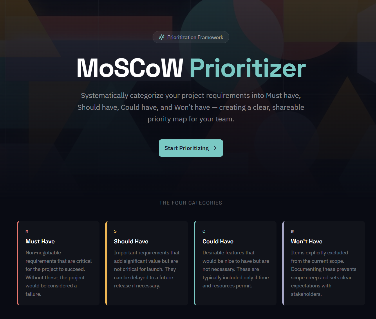 MoSCoW Prioritizer - build a MoSCoW plan Systematically categorize your project requirements into Must have, Should have, Could have, and Won't have — creating a clear, shareable priority map for your team.